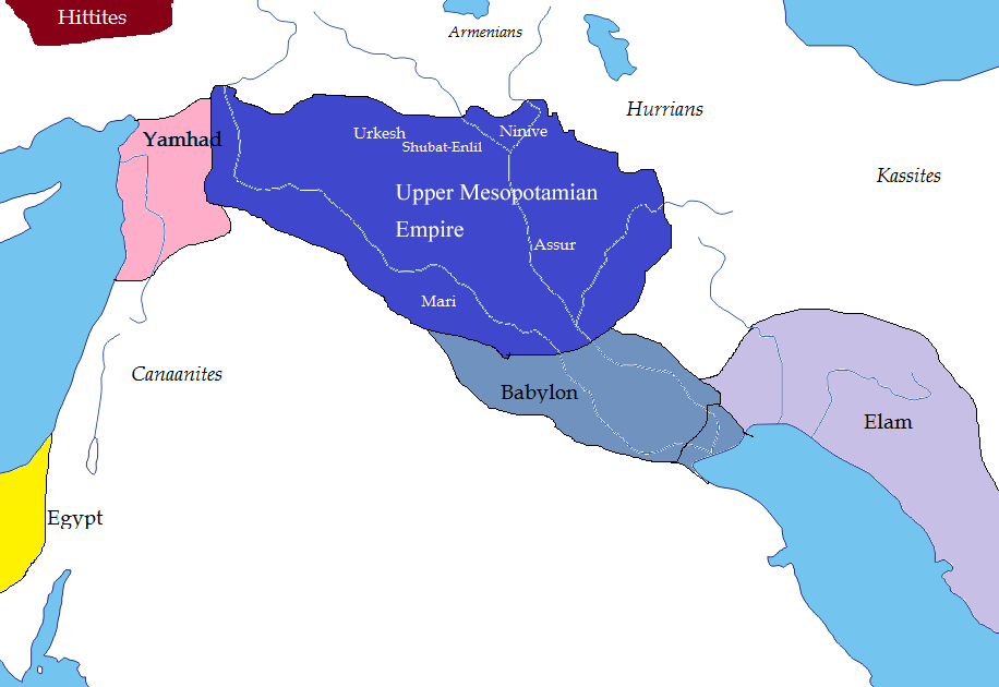 阿摩利人沙马希·阿达德一世原为叙利亚一个小城邦的王子,他几乎白手起家,征服了阿舒尔城乃至整个两河流域北方,此后又吞并了两河流域中部的埃什努纳(Eshnunna)王国,并一度吞并叙利亚的马里王国(Mari Kingdom),并将其国王齐姆里·利姆(Zimri-Lim)驱逐。由此,沙马希·阿达德一世建立起庞大的上美索不达米亚帝国。但在他死后仅一年,齐姆里·利姆就成功复辟,将他的儿子亚斯马赫-阿达德(Yasmah-Adad,公元前1796年 ~ 前1776年在位)驱逐。另一个儿子伊士麦·达干一世即位后,和古巴比伦王国进行了漫长的互相征伐,最终伊士麦·达干遭到驱逐,其子穆特·阿什库尔(公元前1730年 ~ 前1720年在位)不得不向巴比伦屈服进贡。此后随着巴比伦王国的崩溃,亚述的国力也趋于暗弱,至公元前1500年前后为崛起的米坦尼王国征服。