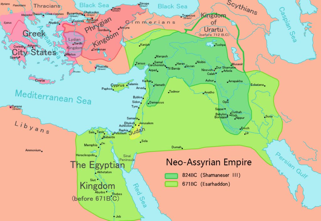 新亚述帝国地图(苹果绿色为夏马内舍尔三世时期,嫩绿色为埃萨尔哈东时期)