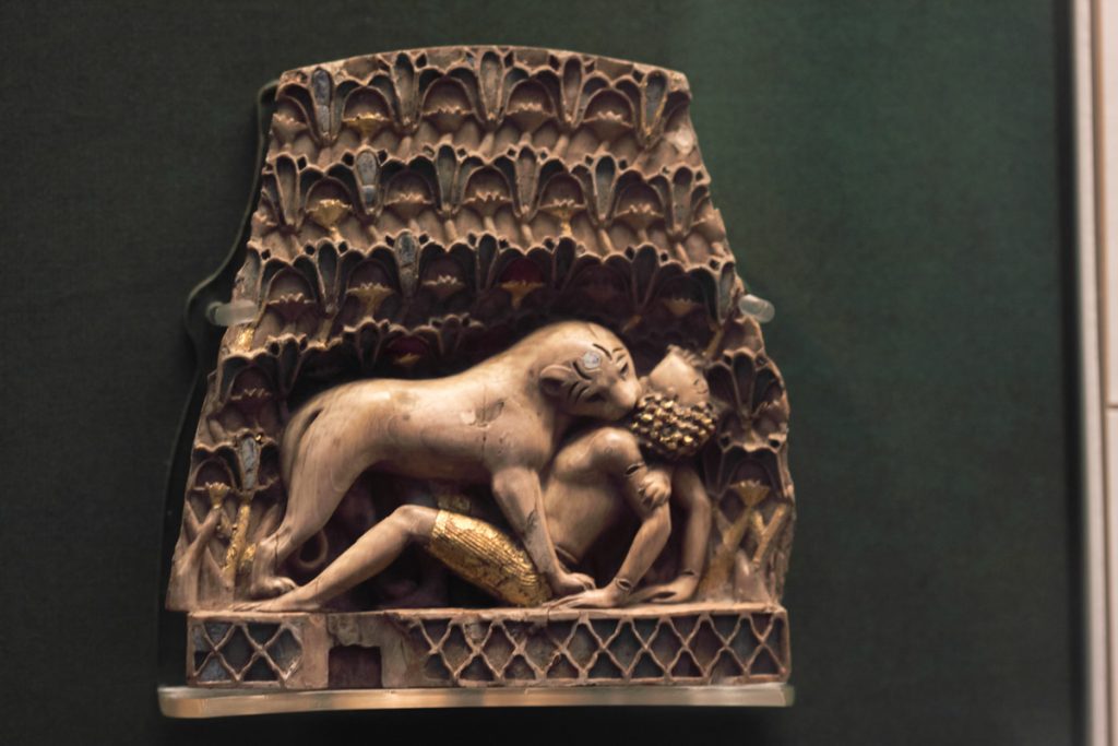母狮撕咬黑人男孩象牙浮雕板,出土于卡尔胡(尼姆鲁德)宫殿,现藏于大英博物馆。