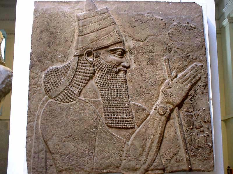 辛纳赫里布接受莱基城(犹太国的第二大城市,位于今以色列南部)投降的浮雕板,出土于尼尼微王宫,现藏于伦敦大英博物馆。