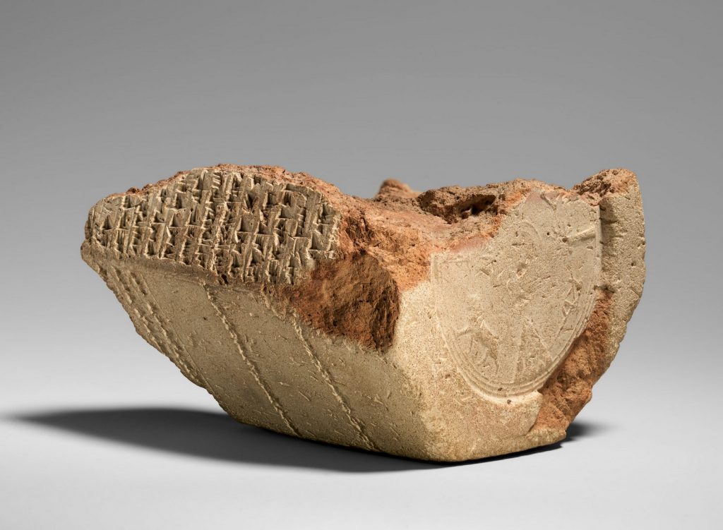 埃萨尔哈东重建巴比伦城的奠基柱形泥板(残),带有亚述象形文字印戳,出土于巴比伦,现藏于美国纽约大都会博物馆。