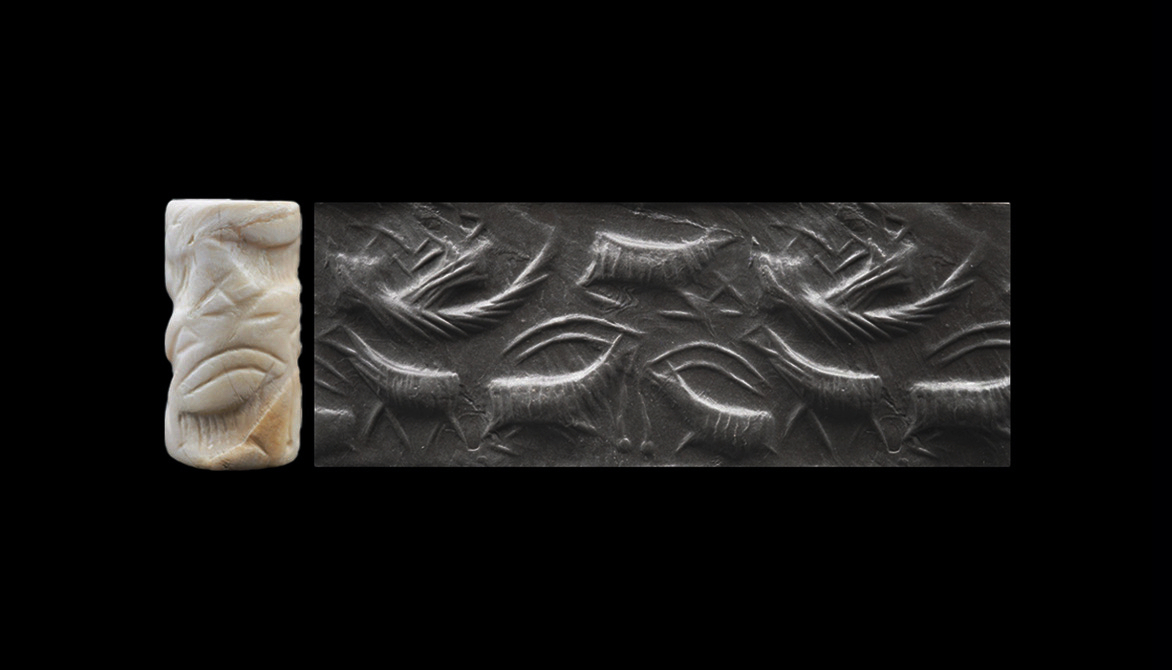1. 较为少见的苏美尔早王朝早期神话题材滚印,描绘了坐着船的神祇。这一图像模式或许和埃阿神的“神祇游行”仪式有关,埃阿是me(构成文明的一种神圣属性)的分配者,他的游行过程象征了将me分散到苏美尔文明的各个核心区域。