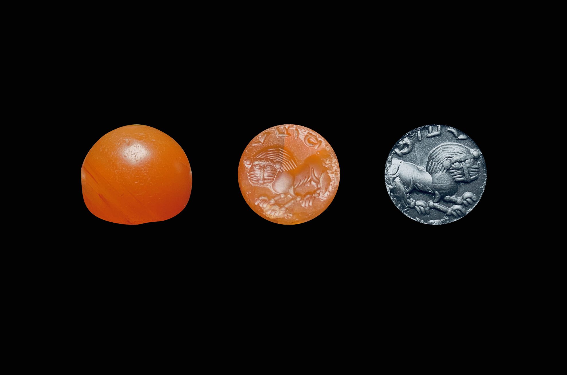 印面雕刻一头卧狮,上方周缘有帕列维文铭文。