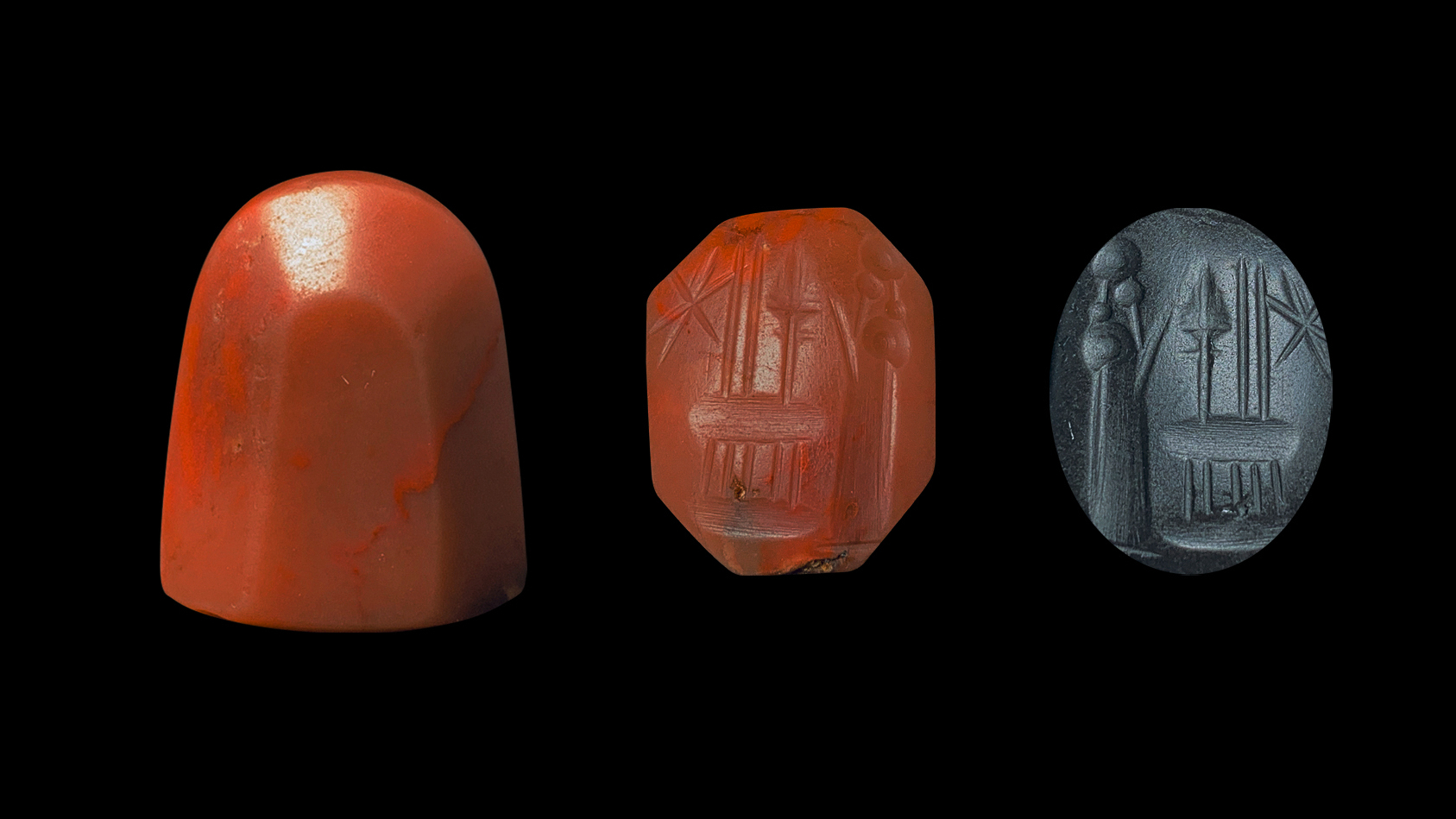 1. 新巴比伦时期流行的标准形制和题材,人物采用钻刻风格描绘,简练而清晰,此类题材中常出现多个神徽和象征符号;