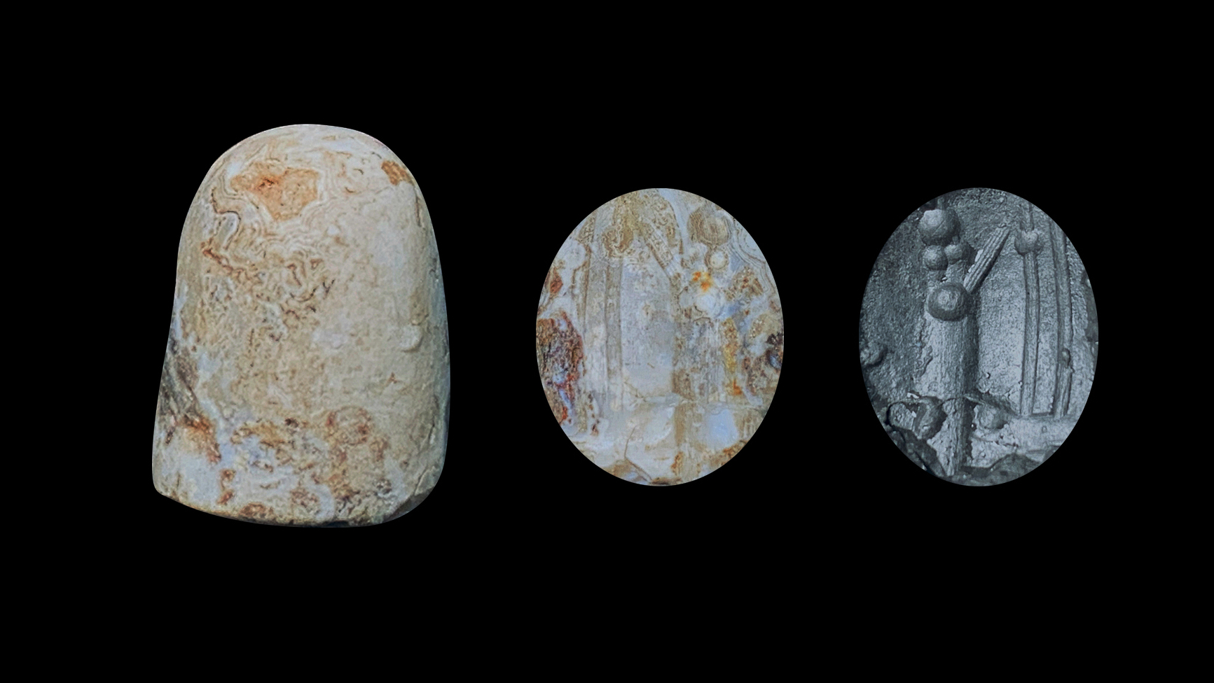 1. 新巴比伦王国时期流行的标准形制和题材,人物采用钻刻风格描绘,简练而清晰,此类题材中常出现多个神徽和象征符号,而菱形符号较为少见;