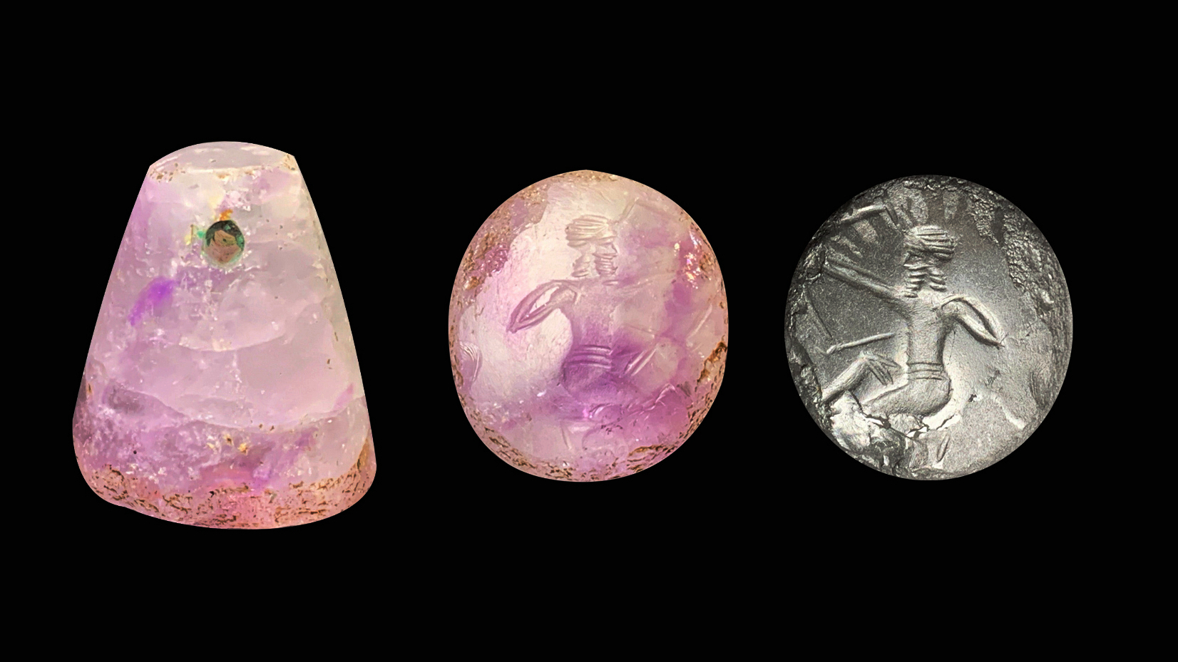1. 塔形印图案中非常罕见的题材,拉弓武士形象见于亚述狩猎题材中,象征王室睥睨四方,征服一切的武力和骁勇,人物姿态紧张中带有坚定,浮雕感强,是两河流域晚期纪念碑艺术的精品;