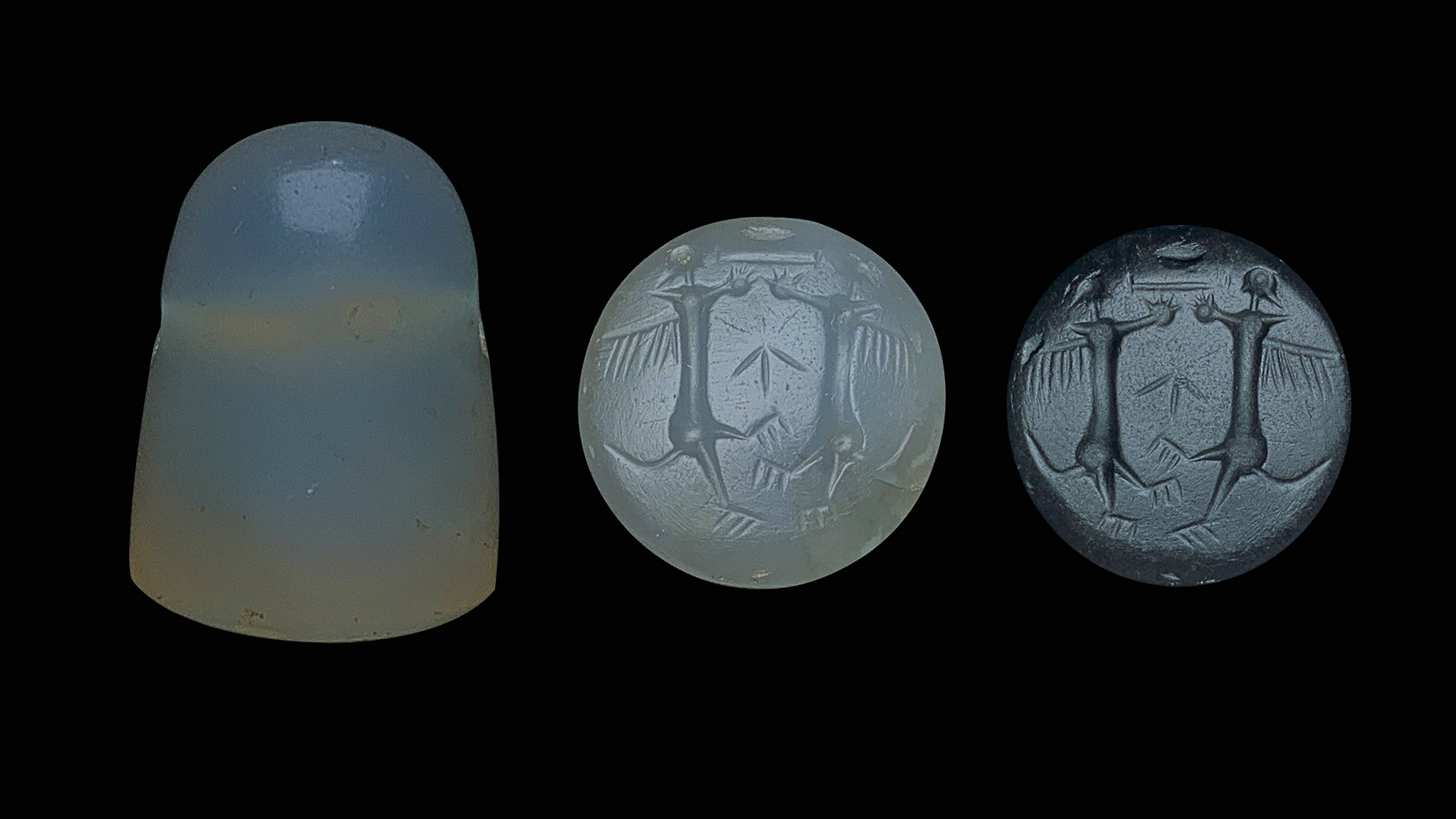 印面雕刻两头狮身人首有翼兽面对面以后腿站立,它们之间有一个分三叉的符号可能是简化的生命树,顶部还有一个符号可能是简化的有翼太阳。