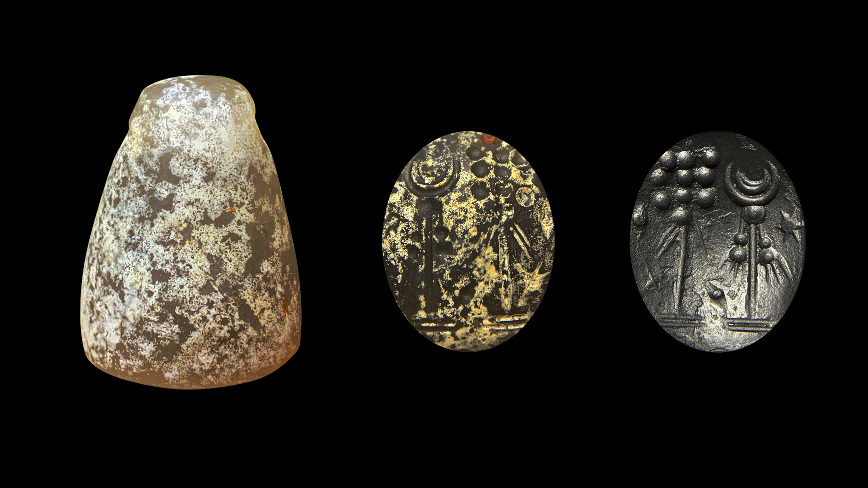 2. 图象中出现了多个神徽,其中左侧的祭坛可能象征昴星团,但十一颗星的表现形式极为少见,可能象征了其他的星象崇拜;右侧月神辛的神徽尚属标准,而场景中的两枚两芒形也是极为特别的,其形态和这一时期流行的菱形徽记(象征健康女神)略为相近,或许暗示了两者间有一定关系;