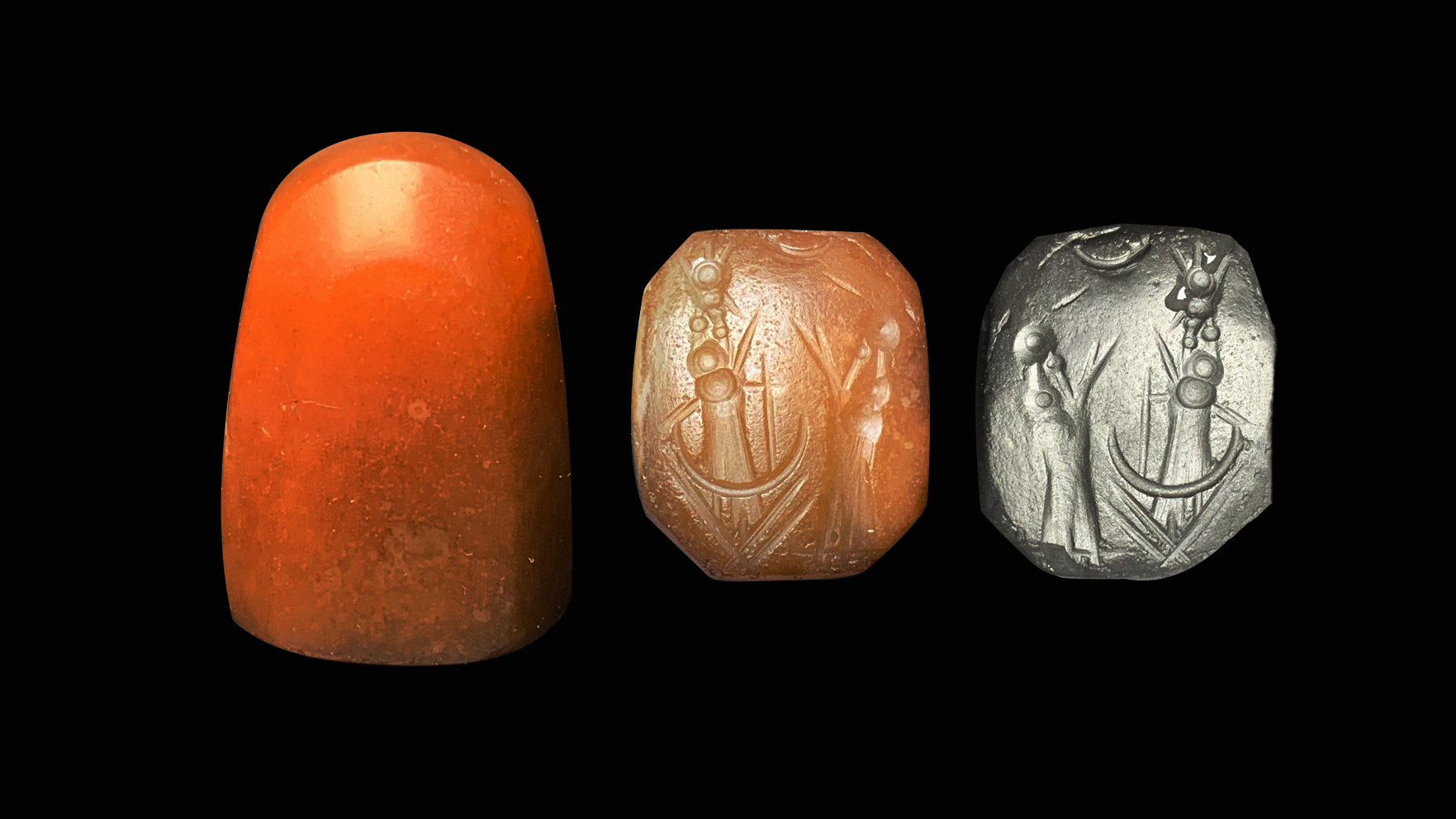 2. 新巴比伦时期流行的标准形制,但纹饰中出现的弯月上的人物极为特别,可能描绘的是月神辛,非常罕见,介于人物头戴城齿冠,此件作品可能制作于阿契美尼德波斯帝国时期;